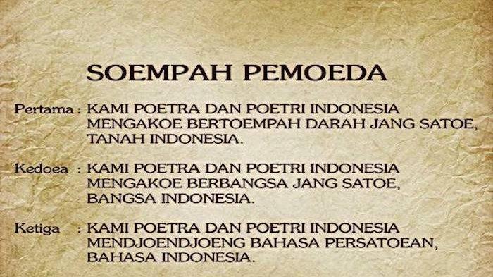 Pertama: Kami putra dan putri Indonesia, mengaku bertumpah darah yang satu, tanah air Indonesia. Kedua: Kami putra dan putri Indonesia, mengaku berbangsa yang satu, bangsa Indonesia. Ketiga: Kami putra dan putri Indonesia, menjunjung bahasa persatuan, bahasa Indonesia.